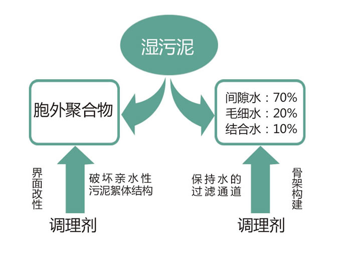 污泥改性调理主要是对污泥颗粒表面的有机物进行改性,破坏污泥的细胞和胶体结构,改变污泥的水分结合状态,同时降低污泥的压塑性,使污泥能满足深度脱水干化处理的要求。