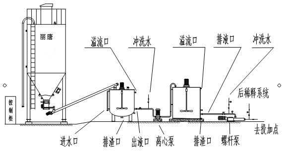 石灰粉末经运输罐车施加的气流将粉末与空气一起输送至投料仓中储存,空气经除尘过滤部件净化后排出,石灰粉末落入储存仓中。储存料仓存储量由料位传感器向控制系统传递信号,安装于料仓底部的石灰投加机定量将物料送出,经变频螺旋输送机在密封的管道中输送至溶解罐,加水配制成要求浓度的溶液,除渣后进入储存罐,用计量泵注入到一个或多个投加点,完成石灰投加。